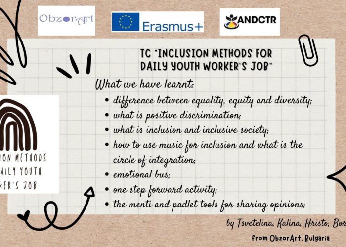 The project is designed for active youth workers in the inclusion field from 10 countries to empower European values, to promote the civic involvement and social inclusion in youth work. It is focused on creating a safe and creative space for participants to share and open up and to exchange ideas and experiences. During the course the participants gained useful competencies in working in inclusion projects.